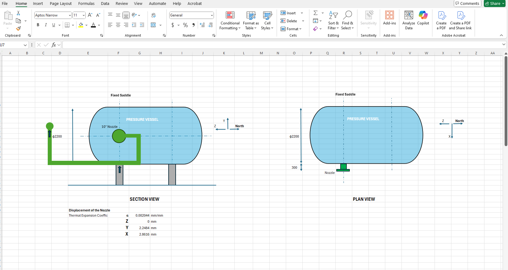 Let’s examine the thermal expansion of the pressure vessel in 3D across the x, y, and z coordinates. We need to determine the location of the equipment’s fixed saddle. This is usually determined by the piping stress engineer. However, it is necessary to communicate with the equipment manufacturer for this. If we need to design according to existing equipment, we should perform the piping stress analysis based on the current situation. For now, let’s calculate and record the thermal expansions for both scenarios.