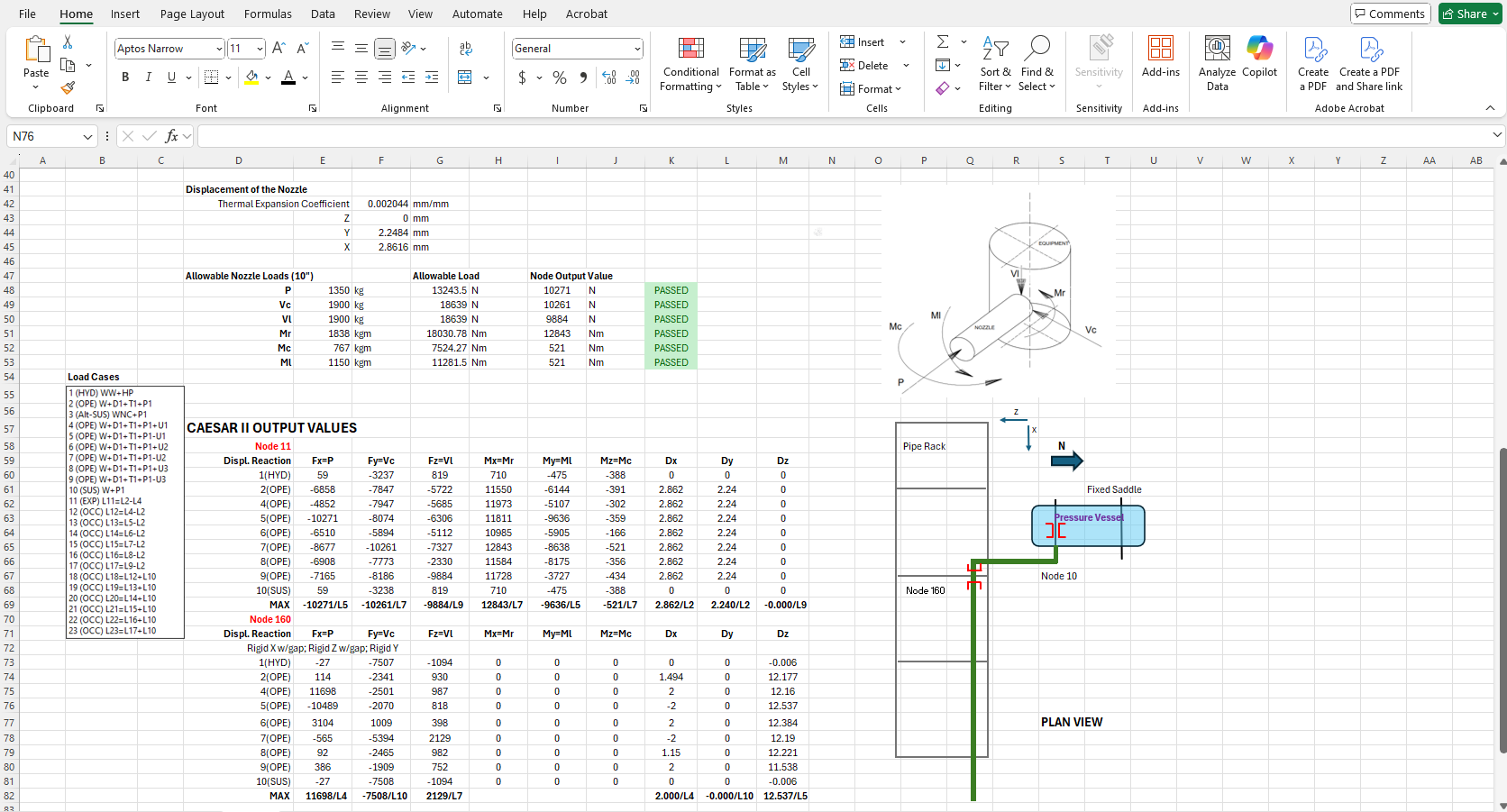 Now, let’s change the position of the fixed saddle. In this case, there will no longer be any displacement of the nozzle in the z-direction. When we input this scenario into Caesar II, we observe that the moments and forces on the nozzle are below the allowable limits.